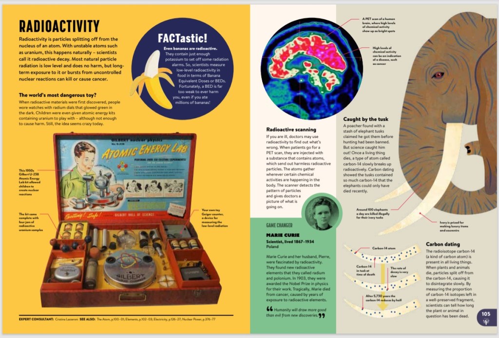 Matter is the perfect chapter for budding scientists, covering information from solids, liquids and gases to compounds, molecules and subatomic particles, the chemistry of life, forces and radioactivity (as pictured above). I know I’m quite old, but I’m very glad I’m not old enough to have received and atomic energy lab in my Christmas Stocking, with actual radio-active material.