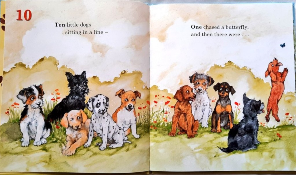Then 8, then 7 and so on, until only one little dog remains. Will there be none? Turn the final page to find out.
