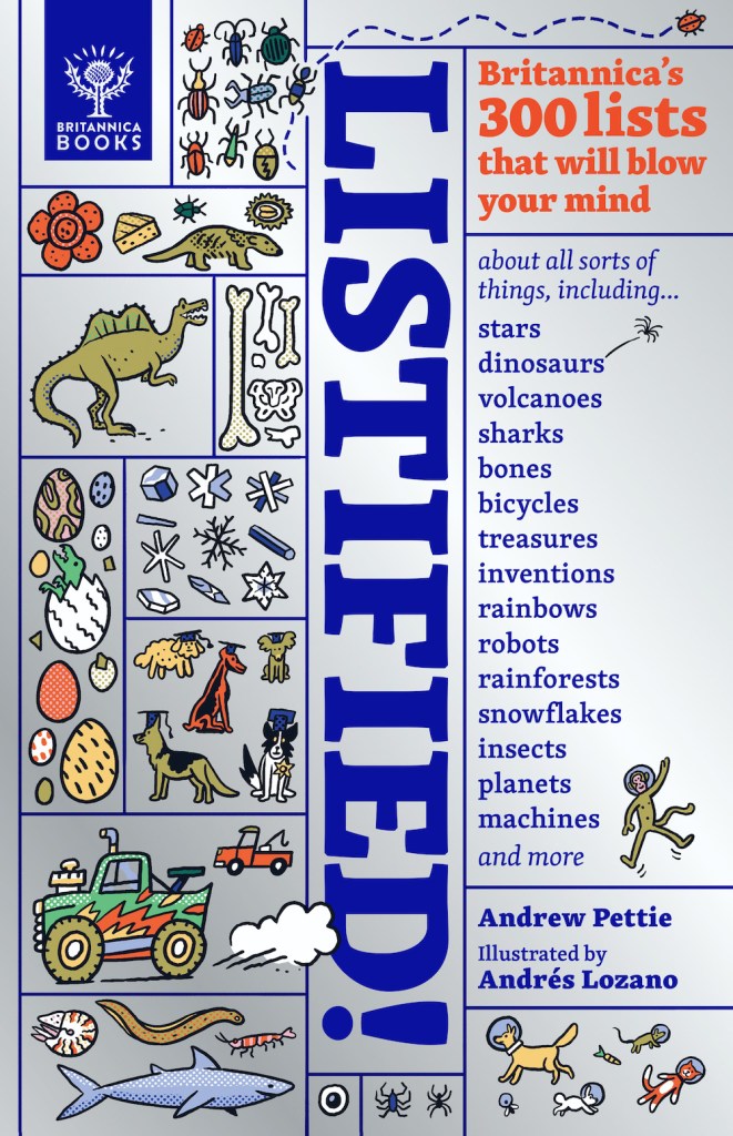 LISTIFIED! Britannica’s 300 lists that will blow your mind by Andrew Pettie, illustrated by Andrés Lozano out now in hardback (£18.99, Britannica Books)